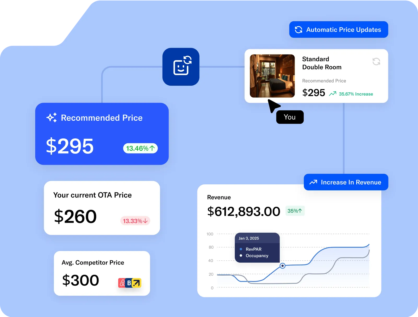 Our AI analyzes competitor rates in real-time and automatically adjusts your pricing strategy